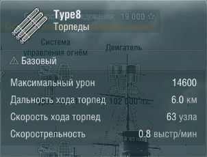 Торпеды Type 8 имеют максимальный урон 14600, плавают на расстояние в 6 км. со скоростью 63 узла. Скорострельность составляет 0.8 выстрела в минуту.